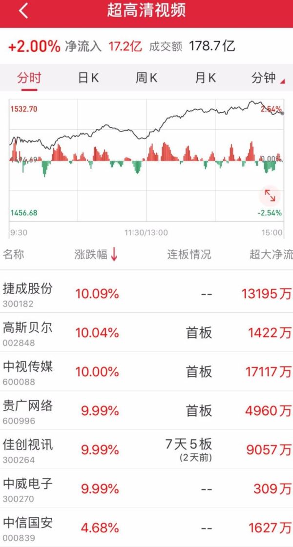 14日,A股超高清视频概念崛起,贵广网络、捷成股份、中威电子午后拉升封板,广电网络、当虹科技、数码科技等跟涨,并有多只个股涨停。