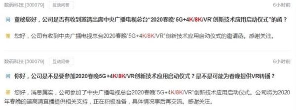 深交所互动易平台显示,从今天下午央视官宣直到夜间,投资者向多家上市公司提问,希望公司回答是否参与8K版央视春晚或布局高清领域。这些公司包括宏达新材、迪威迅、数码科技、创维数字、慈文传媒、华讯方舟等。