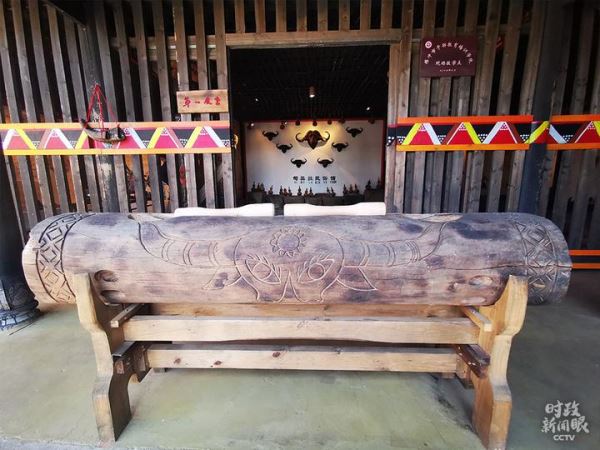 △木鼓,佤语称为克罗克,是佤族的传统祭祀工具、乐器和报警器具,分公鼓、母鼓两种。木鼓上刻的牛,是佤族的图腾。(总台央视记者张晓鹏拍摄)