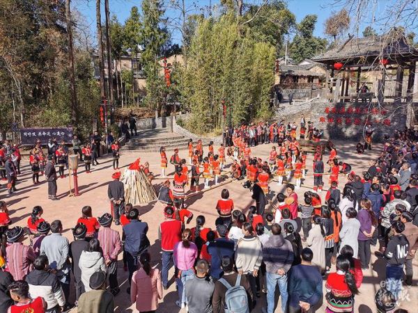 △独家视频丨鼓手在木鼓屋敲响木鼓。当地群众也随之在佤族风情广场跳起欢快的民族舞蹈。(总台央视记者章猛拍摄)