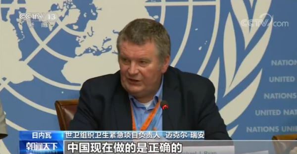 迈克尔·瑞安说,中国政府给人留下深刻的印象。他表示,从个人角度来说,从来没见过对这样的高危事件如此负责的政府,中国各级政府非常有组织地在处理这个危机,面对如此巨大的挑战,中国政府的回应是非常优秀的。