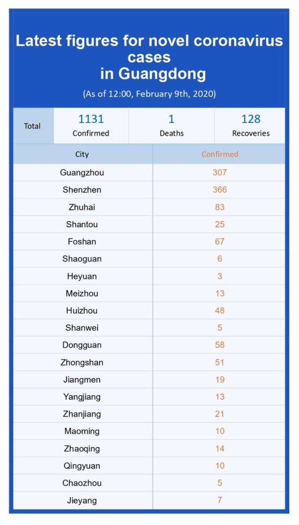 截至2月9日12时,广东省累计报告新型冠状病毒感染的肺炎确诊病例1131例。9日当天0-12时全省新增确诊病例11例。累计出院128例。累计死亡1例。另有疑似病例208例。有3197名密切接触者正在接受医学观察。