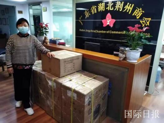 ▲广东省湖北荆州商会工作人员随时接收会员捐赠的防抗疫物资