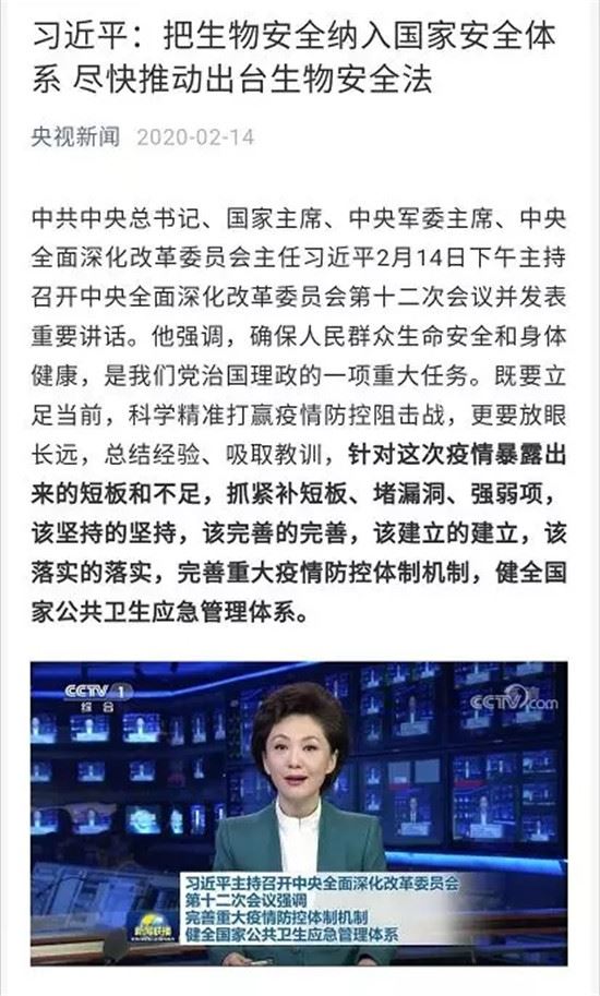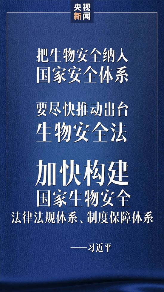 习近平强调,要强化公共卫生法治保障,全面加强和完善公共卫生领域相关法律法规建设,认真评估传染病防治法、野生动物保护法等法律法规的修改完善。要从保护人民健康、保障国家安全、维护国家长治久安的高度,把生物安全纳入国家安全体系,系统规划国家生物安全风险防控和治理体系建设,全面提高国家生物安全治理能力。要尽快推动出台生物安全法,加快构建国家生物安全法律法规体系、制度保障体系。