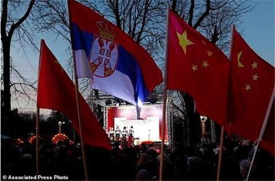 ▲当地民众挥舞中国和塞尔维亚两国国旗。(图:美联社)