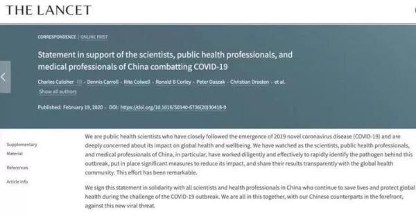 27名国际顶尖公共卫生科学家18日在知名医学期刊《柳叶刀》发表声明,强烈谴责“认为该新型冠状病毒疾病并非自然起源的阴谋论”,认为这样的阴谋论“除了制造恐慌、谣言、偏见、损害防疫工作外,别无他用”。 该声明还称赞中国卫生专家工作“卓越”,并号召更多人签名支持。