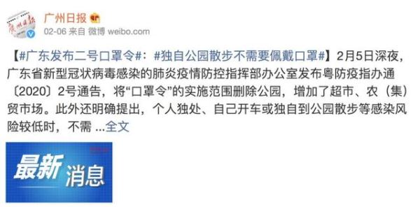 2月5日,广东省新型冠状病毒感染的肺炎疫情防控指挥部办公室发布粤防疫指办通〔2020〕2号通告,将“口罩令”的实施范围删除公园,增加了超市、农(集)贸市场。