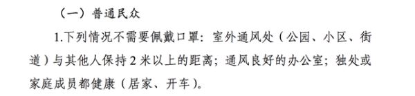 此外还明确提出,个人独处、自己开车或独自到公园散步等感染风险较低时,不需要佩戴口罩;在非疫区空旷且通风场所不需要佩戴口罩。