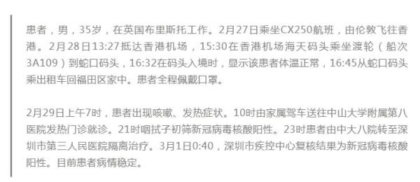 中广核这几年在英国布里斯托坐镇辛克利角-C核电站项目,患者2月27日乘出租车离开布里斯托,经伦敦离境,乘机时除吃饭外,全程佩戴口罩。28号到香港,乘迅隆3号船抵达深圳,之后换乘邮轮从香港至蛇口码头,由家人驾车接回深圳家中。