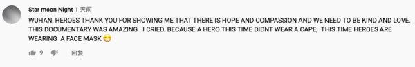YouTube海外网友Star moon Night表示,“纪录片太棒了,我看哭了。这次,英雄并没有穿着披风,而是戴着口罩。”