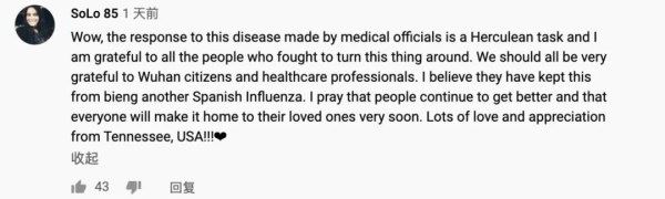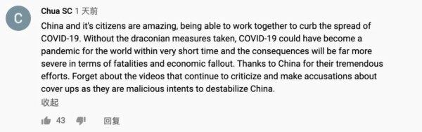 YouTube海外网友Chua SC称赞道,“中国和中国人民真的很棒,能够团结起来防控疫情。如果不采取严厉的措施,新冠肺炎可能在很短的时间内成为世界性流行病,死亡人数和经济损失会更加严重。”