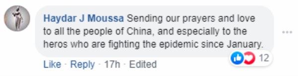 Facebook网友Haydar J Moussa评论:“向所有中国人民送上我们的祝福和爱,尤其是那些从一月起就和疫情作斗争的英雄们。”