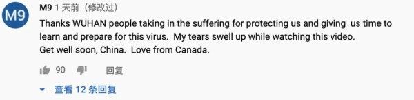 加拿大网友M9表示,“感谢武汉人民牺牲自己保护了我们,让我们有时间了解情况,并提前做好应对病毒的准备。看这段视频时,我的泪水涌了出来。快点好起来,中国。”