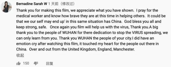 英国网友Bernadine Sarah W评论:“感谢这部纪录片,它为我们提供了抗击疫情的宝贵经验。非常感谢武汉人民用他们的献身精神阻止了病毒进一步传播。我们应该向他们学习。感谢武汉人民。”