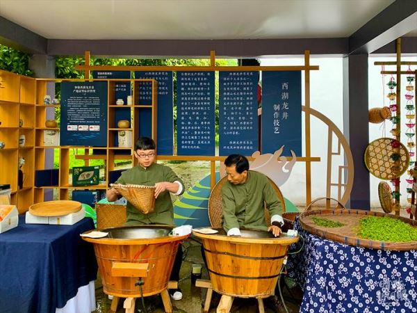 △西湖龙井以“色绿、香郁、味甘、形美”著称于世,这是制作技艺展示区。(总台央视记者段德文拍摄)