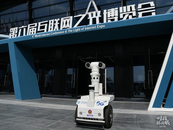△这是“互联网之光”博览会展馆前的5G警用机器人。