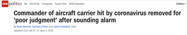 美国有线电视新闻网(CNN)称,克罗泽尔在信件中写道,“如果我们现在不采取行动,我们将无法妥善照顾我们最值得信赖的资产——舰员。”CNN援引一位美国国防官员上周五(3月27日)透露的消息称,“罗斯福”上已有137名舰员新冠病毒测试呈阳性,“占美国军方确诊人数的10%以上”。但讽刺的是,美国军方却将解职决定归咎于克罗泽尔“糟糕的判断力”。