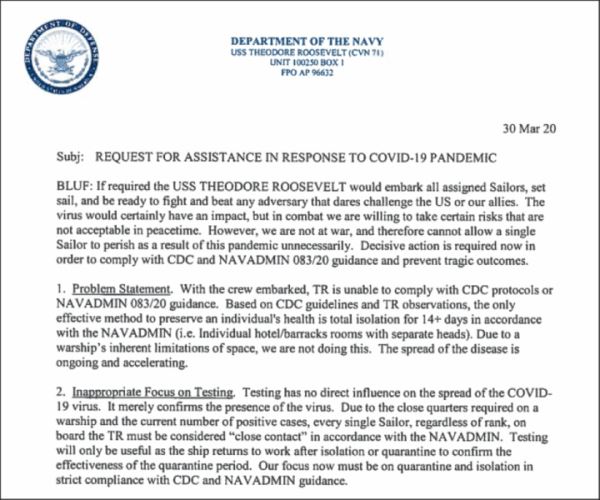 先从此事的关键点——求援信说起。3月下旬,由于更多舰员被确诊患上新冠肺炎,克罗泽尔给美国海军高层发了封信,指出舰上的情况正在“快速恶化”,请求允许舰上数千名舰员尽快下船隔离。
