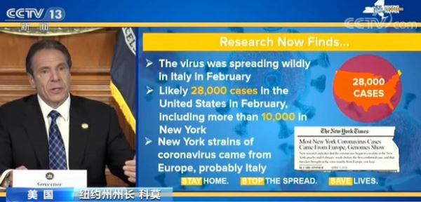 纽约州州长 科莫:新冠病毒不是从中国,而是从欧洲传入纽约州的。