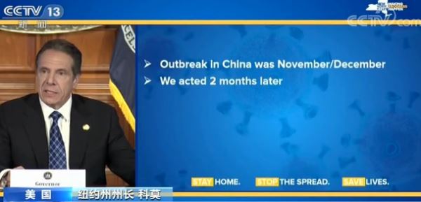 纽约州州长 科莫:中国暴发疫情后的两个月我们才有动作,现在回过头想想,难道是有人觉得病毒会一直待在中国等着我们有所行动吗?而且等了两个月吗?