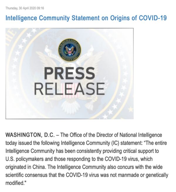 当地时间4月30日,美国国家情报局局长办公室在官方网站上发布了一个声明,表示“整个情报界一直以来都在向美国决策者和相关人员提供在中国暴发的新冠病毒的关键性支持。情报界同意科学界的广泛共识,即新冠病毒不是人造的,也未经过基因改造。”