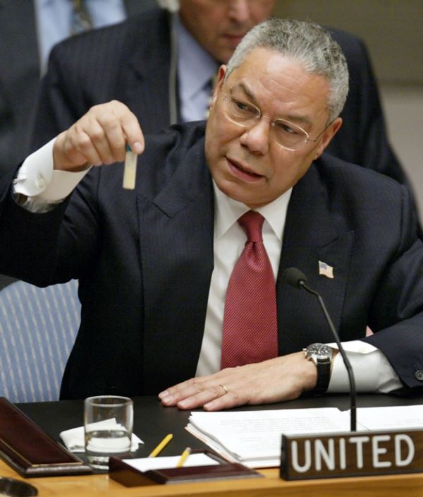 图:前国务卿鲍威尔手持未知粉末,说这是伊拉克拥有大规模杀伤性武器证据,情报界担心“洗衣粉事件”再度上演