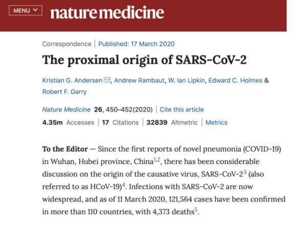 5位科学家在3月发表在《自然医学》(NatureMedicine)杂志上的一篇论文中写道,“由于我们在自然界相关的冠状病毒中观察到了新冠病毒的所有显著特征,包括优化的核糖核酸结合域(RBD)和多碱基裂解位点,我们认为任何类型的实验室来源理论都是不可能的。”
