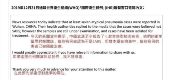 一封邮件的内容究竟是什么,并没有太多模糊空间。国台办发言人朱凤莲就此指出,邮件仅是引述了武汉卫生健康委12月31日公布的内容,并没有其他信息。世卫组织总干事谭德塞明确重申,邮件只是要求给予关于疫情的详细说明,并没有提及新冠病毒会人传人的现象。世卫组织收到的第一份关于疫情的通报来自武汉,并非来自台湾。