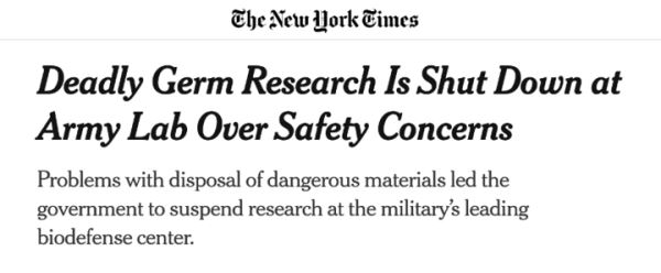 据《纽约时报》报道,疾控中心指出,美国陆军传染病医学研究所没有“完善的系统”来净化实验室的废水。但是,疾控中心以“国家安全原因”为由,拒绝公布有关其决定的信息。