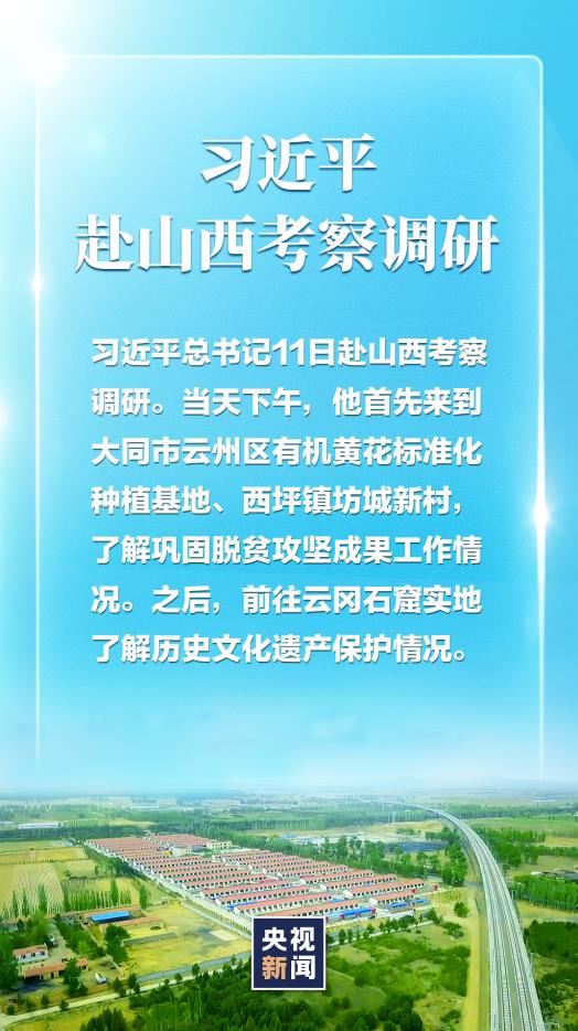 习近平总书记11日赴山西考察调研。当天下午,他首先来到大同市云州区有机黄花标准化种植基地、西坪镇坊城新村,了解巩固脱贫攻坚成果工作情况。之后,前往云冈石窟实地了解历史文化遗产保护情况。