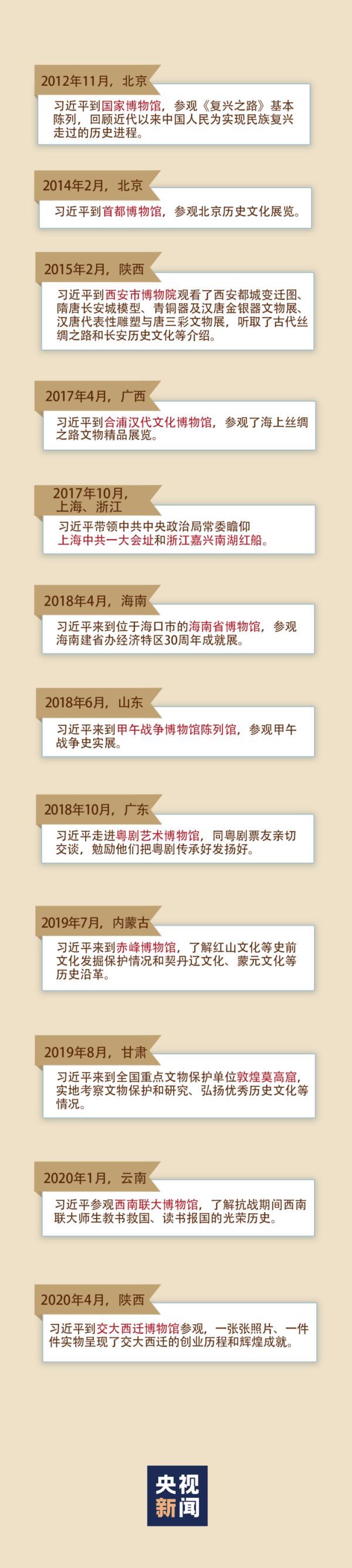 习近平一直高度重视文物工作和文化传承。党的十八大以来,习近平经常“打卡”博物馆,察看具有地方文化色彩的展品,对文物保护和文化传承工作作出重要安排部署。他多次强调,推动中华文明创造性转化和创新性发展,激活其生命力,“让收藏在博物馆里的文物、陈列在广阔大地上的遗产、书写在古籍里的文字都活起来”。