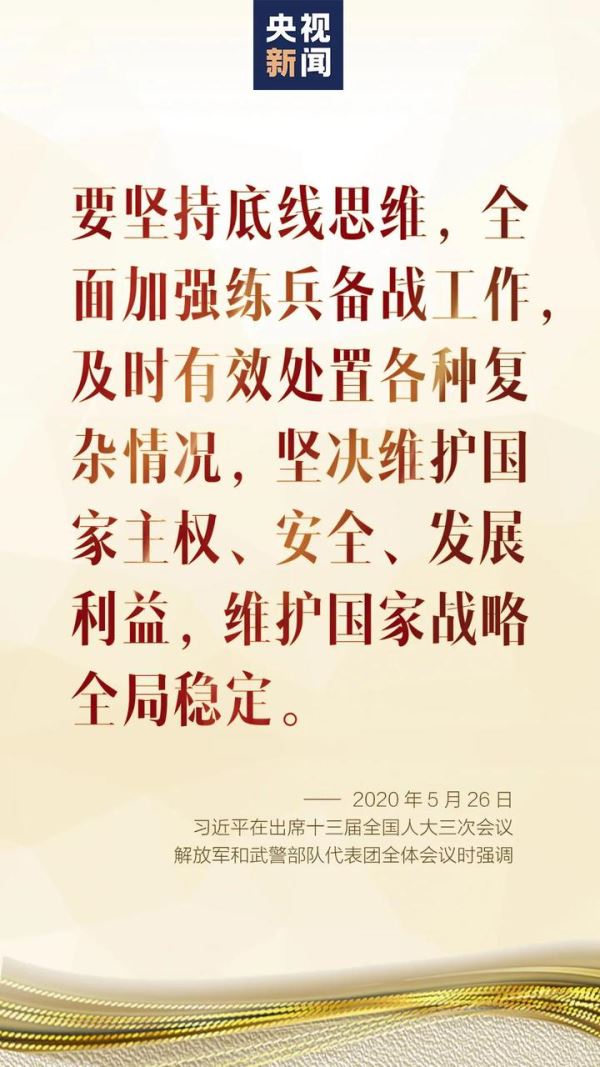 1.坚持底线思维,全面加强练兵备战工作,及时有效处置各种复杂情况,坚决维护国家主权、安全、发展利益,维护国家战略全局稳定。