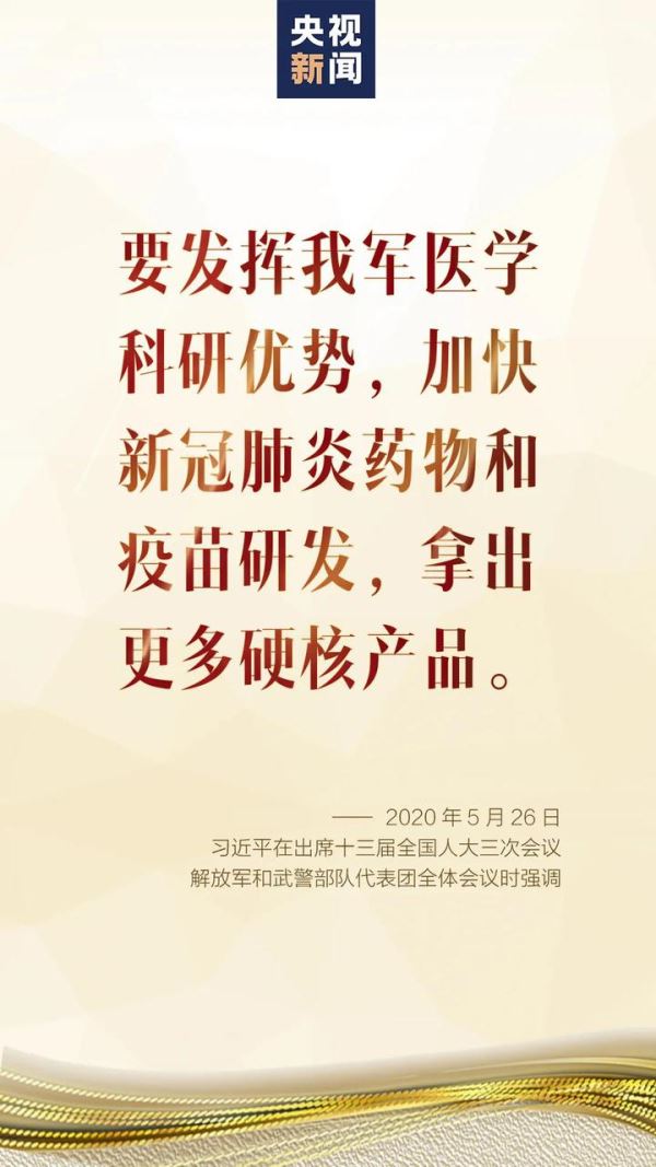 发挥我军医学科研优势,加快新冠肺炎药物和疫苗研发,拿出更多硬核产品。