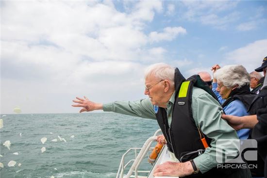 前来凭吊的后代向大海撒花,表达深深的哀思