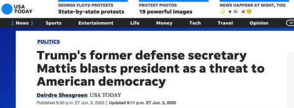 据《今日美国报》报道,美国前国防部长詹姆斯·马蒂斯也在一份公开声明中,谴责总统特朗普在应对美国国内抗议时滥用行政权力。马蒂斯批评特朗普不但不团结美国人民,还试图分裂社会,抨击他对美国民主构成威胁。