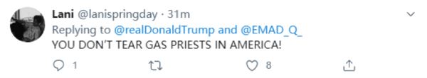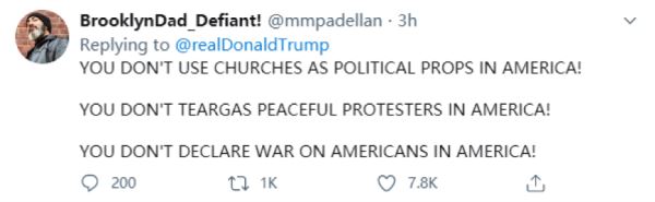网民:“在美国,你不能把教堂当作政治道具!在美国,你不能对和平抗议者使用催泪瓦斯!你不能在美国对美国人宣战!”↓