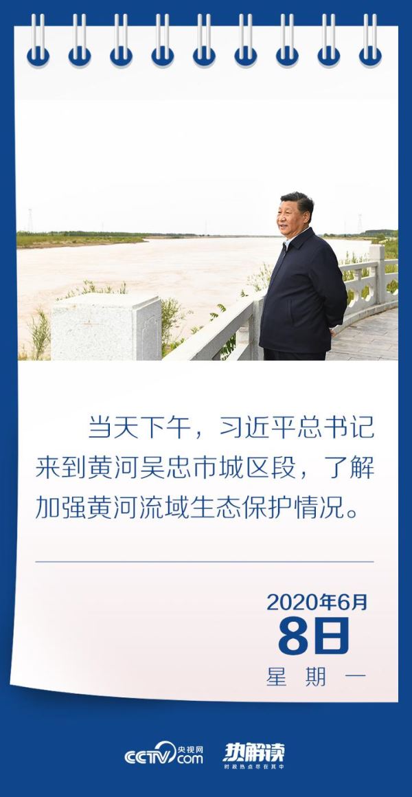 6月8日,宁夏之行第二站,习近平总书记来到黄河吴忠城区段了解当地保护黄河生态等情况。驻足黄河岸边,习近平极目远眺。天高水阔,林草丰茂,一片勃勃生机。