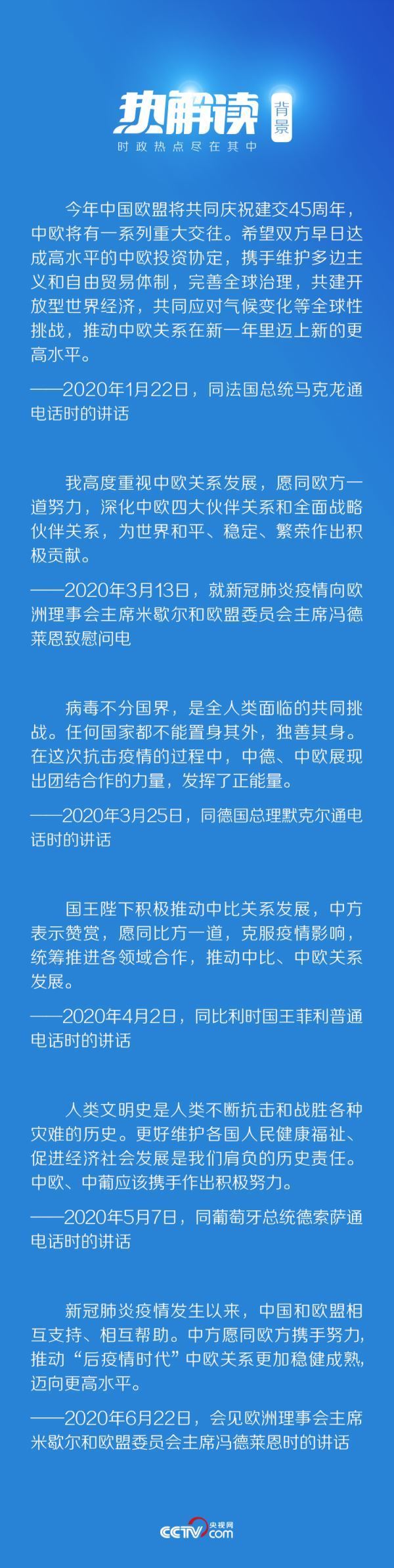 习近平指出,疫情冲击下的世界正在深刻变化,面临更多不稳定不确定因素。我曾提出,要努力在危机中育新机,于变局中开新局。这一点也适用于中欧关系。