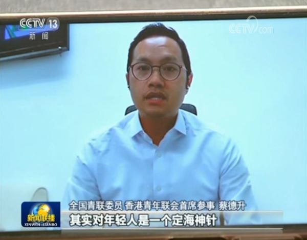 全国青联委员、香港青年联会首席参事 蔡德升:这个国安立法一出来,其实对年轻人是一个定海神针。为什么这样讲呢?因为其实有好多年轻人,他们已经厌倦了过去一年的社会运动,而且他们也很期待可以重新回到香港一个繁荣的社会,也对他们未来工作有很大的帮助。