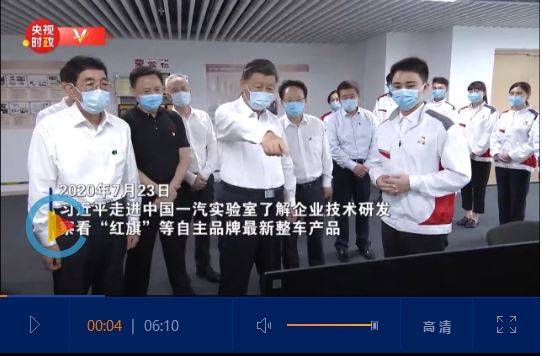 2020年7月23日下午,正在吉林考察的习近平总书记来到中国一汽集团研发总院,走进实验室了解企业技术研发情况,并察看了“红旗”等自主品牌的最新款式整车产品。习近平鼓励一汽人,要把关键技术、核心技术掌握在自己手里,“我们就要立这个志向,一定要把我们的民族品牌搞上去。”