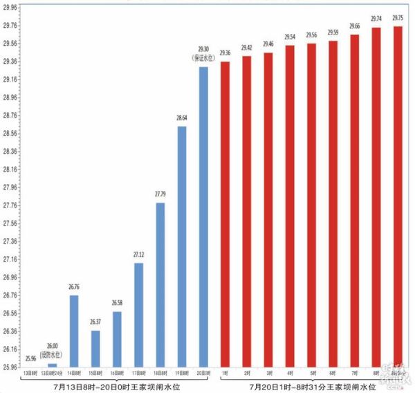 今年7月20日8时30分,王家坝闸水位已达29.75米,超过保证水位0.45米,王家坝闸接到了国家防总开闸蓄洪的命令。