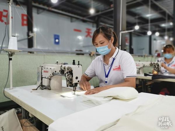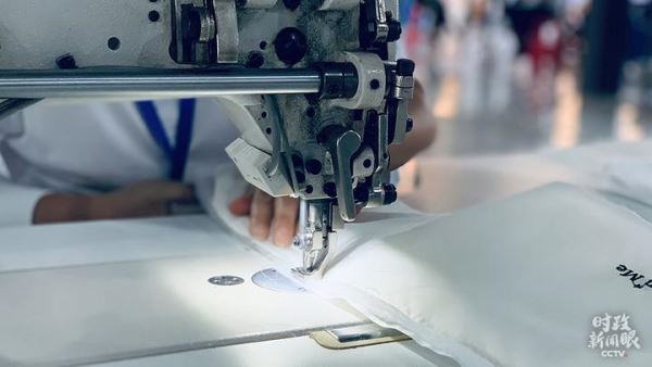 △正在缝制中的书包(总台央视记者邢彬拍摄)