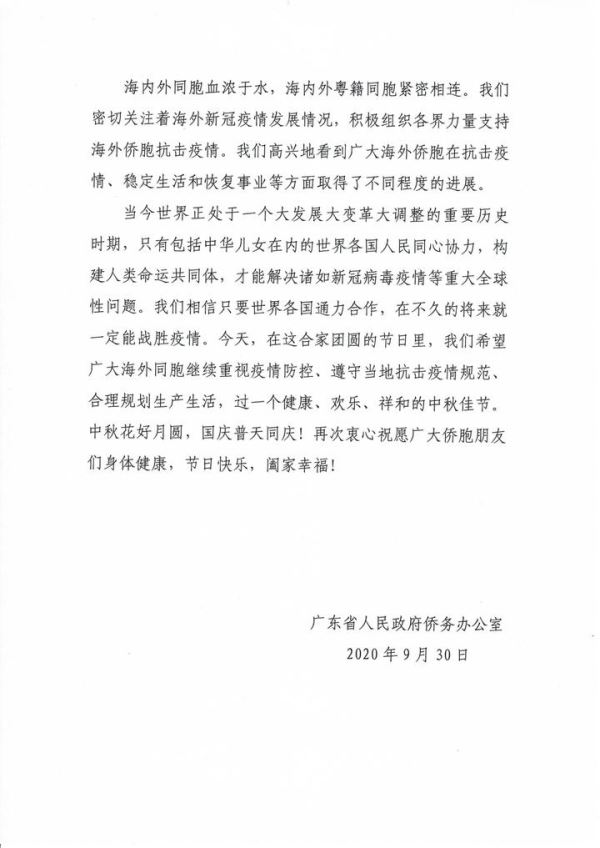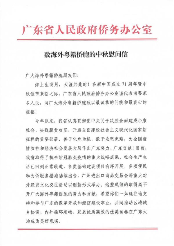 致海外粤籍侨胞的中秋慰问信