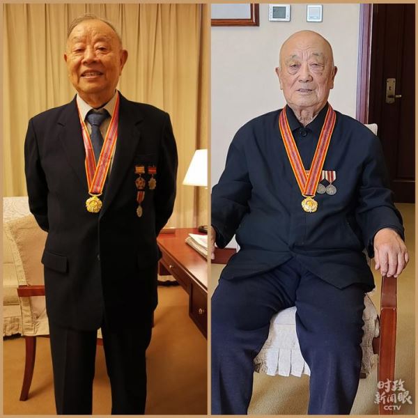 △今年86岁的张元杰(左)参加过上甘岭战役,荣获三等功2次,90岁的王德启(右)在抗美援朝期间荣立三等功4次。他们都出席了当天的纪念大会。(总台央视记者王晓东、赵化拍摄)
