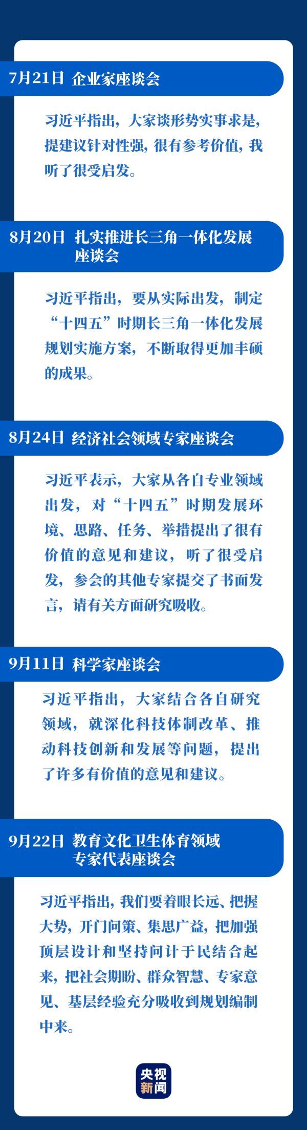 企业家座谈会、党外人士座谈会、扎实推进长三角一体化发展座谈会、经济社会领域专家座谈会、科学家座谈会、基层代表座谈会、教育文化卫生体育领域专家代表座谈会......一段时间以来,习近平主持召开多场座谈会,对象、主题各有不同,但有一个共同的目的,就是“听取意见和建议”。