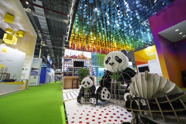 △在国家会展中心(上海)西入口处,吉祥物熊猫“进宝”欢迎进博会各国嘉宾。