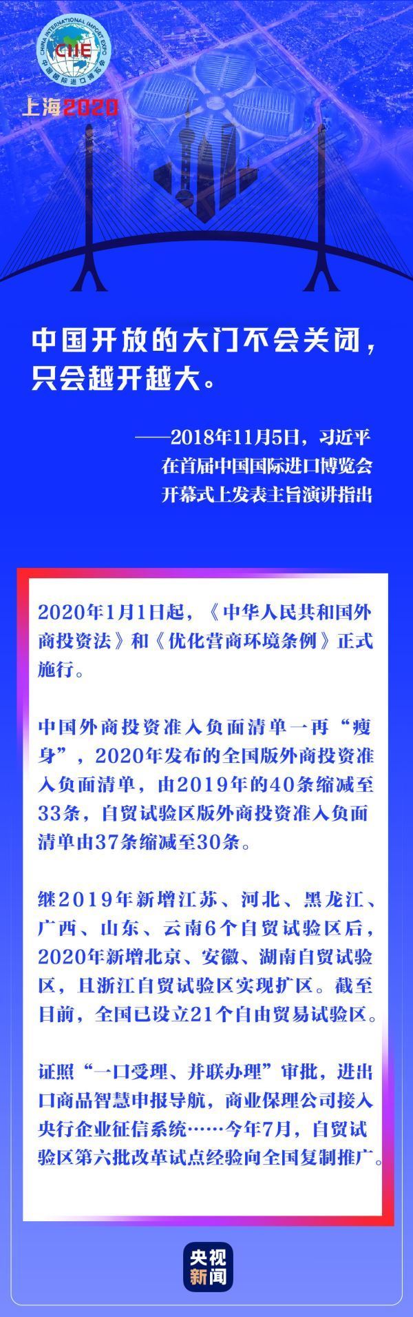 从首届进博会宣布进一步扩大开放的“五大举措”,到第二届进博会强调继续扩大市场开放、完善开放格局、优化营商环境、深化多双边合作、推进共建“一带一路”, 进博会印刻着中国加快推动形成全面开放新格局的坚实足迹,为各国创造更广阔的发展空间。