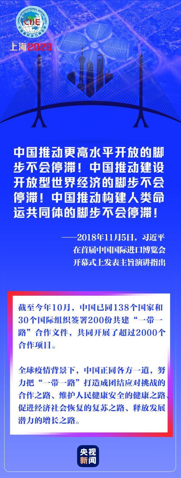 在新冠肺炎疫情全球蔓延、世界经济持续低迷的非常时期,进博会如期而至,为世界各国各地区搭建通往更多市场机遇、投资机遇、增长机遇的桥梁。