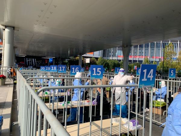 ▲ 11月1日,在上海国家会展中心外,核酸采样人员正在为进场工作人员采集鼻拭子样本。