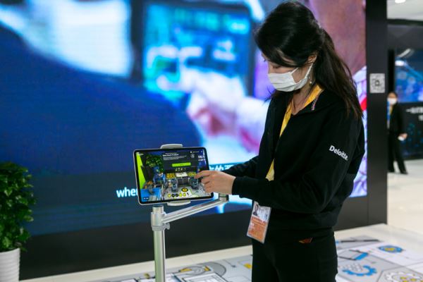 ▲ 11月5日,在第三届进博会服务贸易展区,工作人员通过AR技术展示智能工厂的应用场景。
